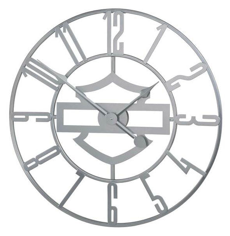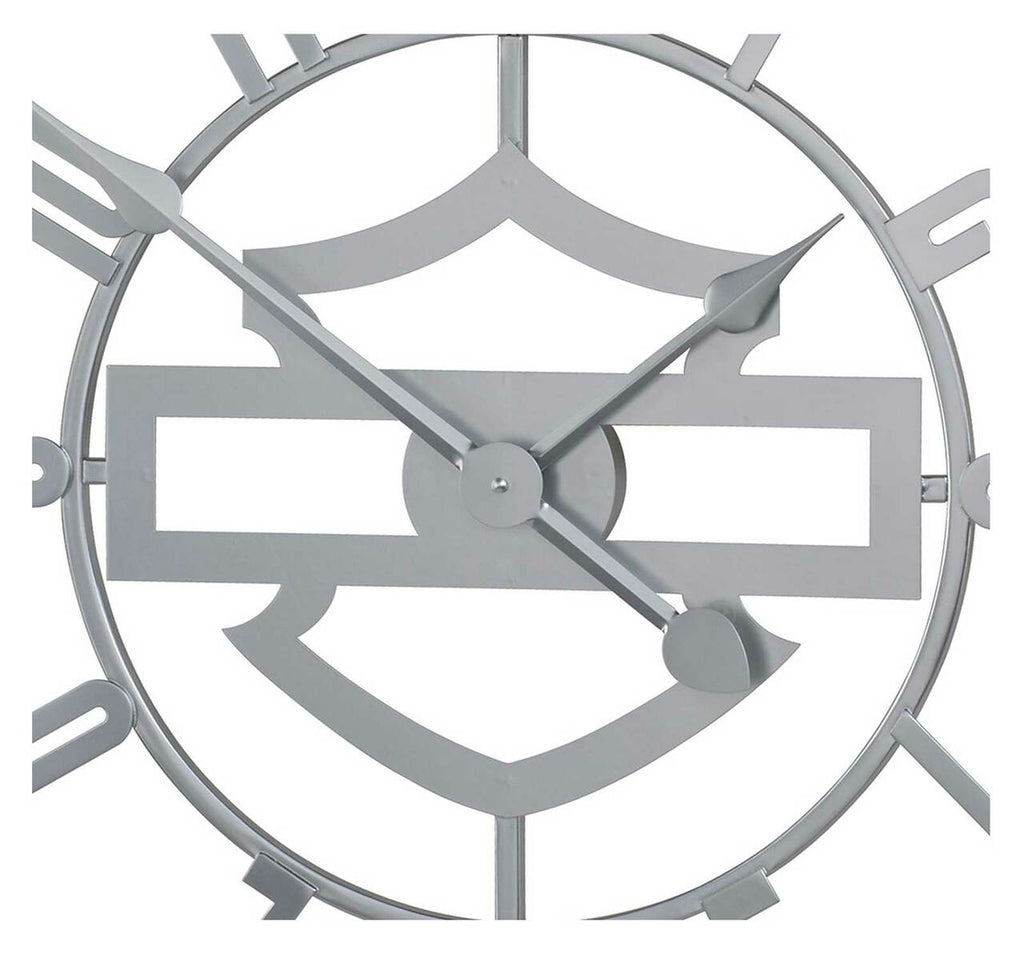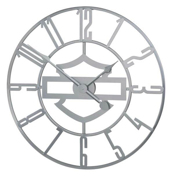 Harley-Davidson® Silhouette B&S Open Face Metal Clock - Silver, HDX-99214. Round metal clock with oversized numbers and silhouette Bar & Shield logo in center. Continuous sweep AA battery operated clock movement. Dimensions: 24" diameter.