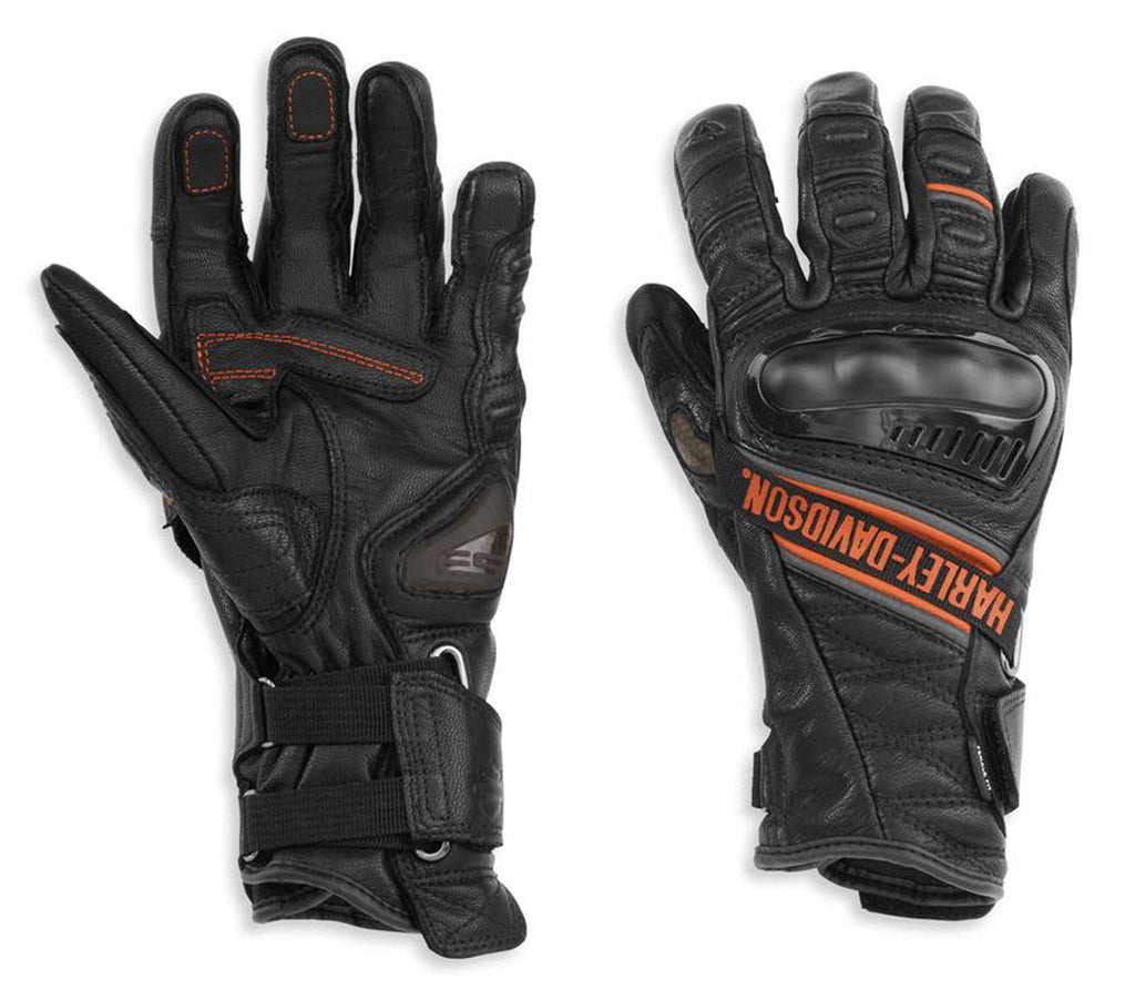 Harley-Davidson® Women's Passage Adventure Gauntlet Gloves - Black, 98188-21VW. Ventilation openings in the hard-shell knuckle ensure adequate air-flow for comfortable cooling. Exterior seam stitching eliminates pressure points and provides the sensitivity every rider demands. The wrist and cuff adjustment provides a secure and precise fit. The insulated and waterproof Passage adventure gloves are ready for all-weather action thanks to Hydratex waterproofing and grip technology that will make sure hands stay warmer when it's cold and drier when you perspire. Advanced coverage is provided by a honeycomb structure of TPU, topped by an aluminum high-impact shield. The palm and thumb are covered by an abrasion-resistant TPU hard shell slider. Certified to EN 13594:2015. Technology meets total comfort. Go beyond these gloves to be all-weather ready from top to bottom with our interchangeable Passage Adventure and Grit Adventure Modular Helmets, Jackets, and Pants. 98188-21VW